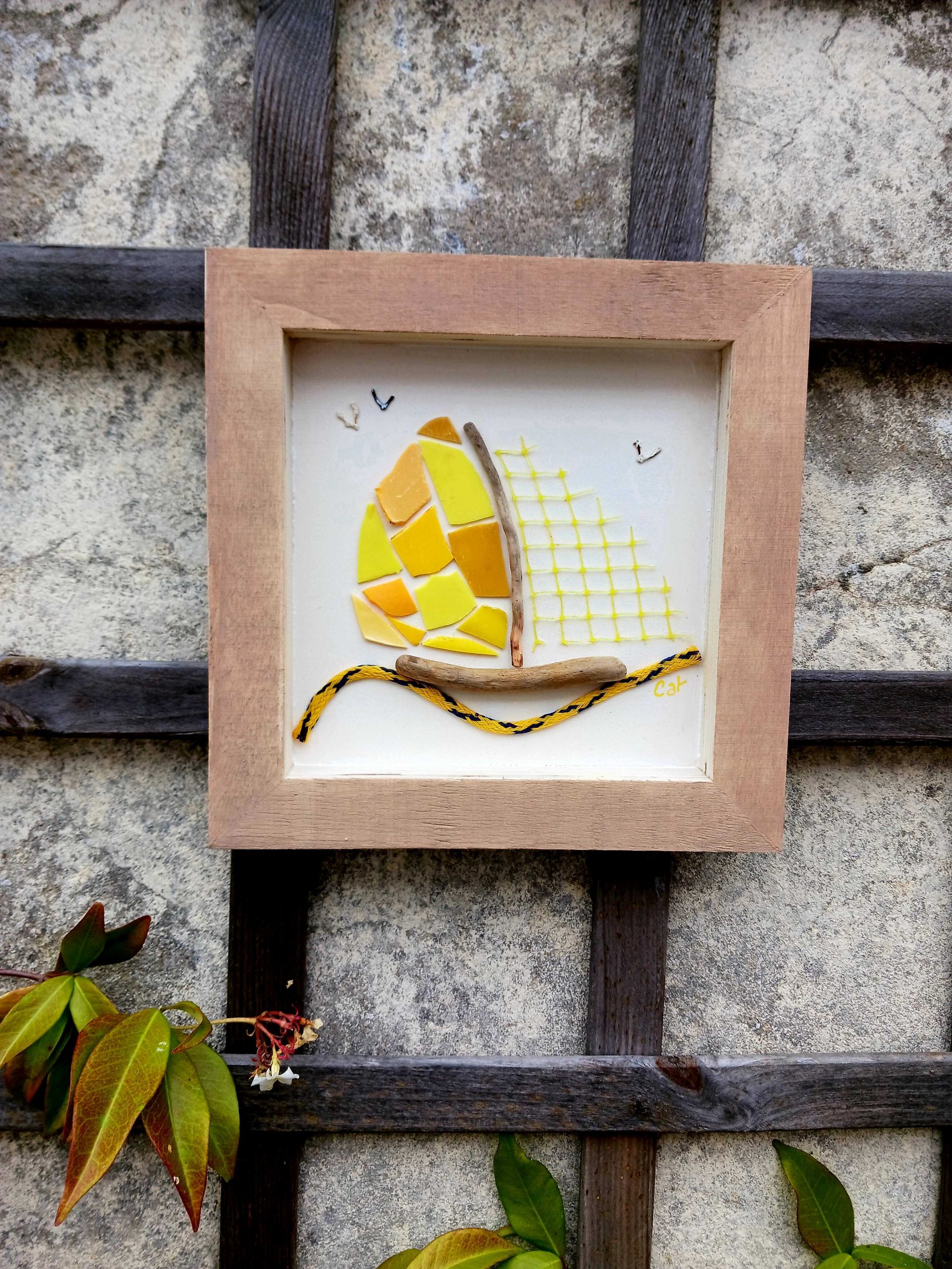 Collage plastiques, bois, algue, filet (recyclage de plage)