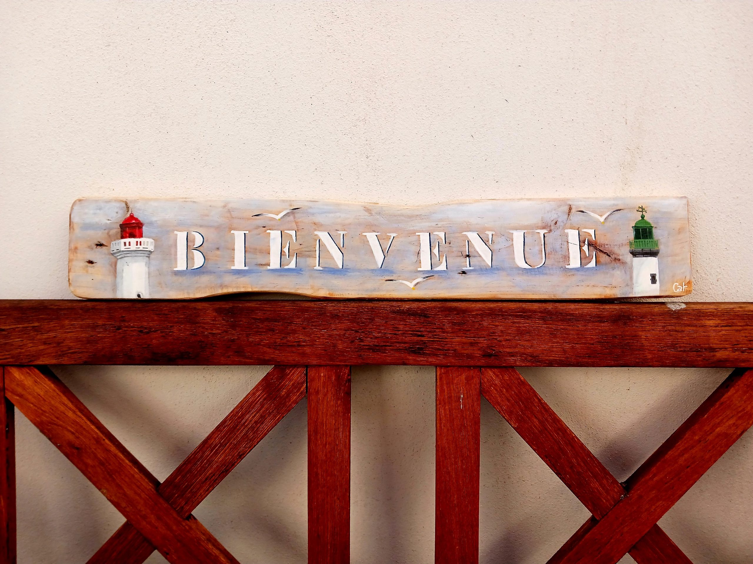 Une planche de bois flotté annonçant la BIENVENUE et ses 2 phares rouge et blanc