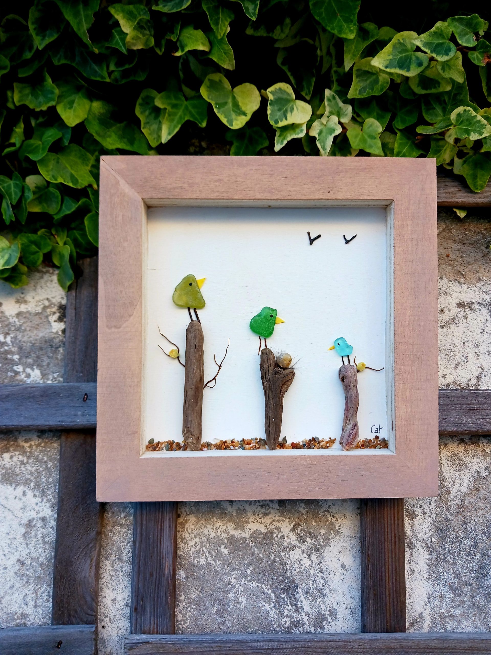 Verre poli, caoutchouc, algue, bois flotté, plume, galet