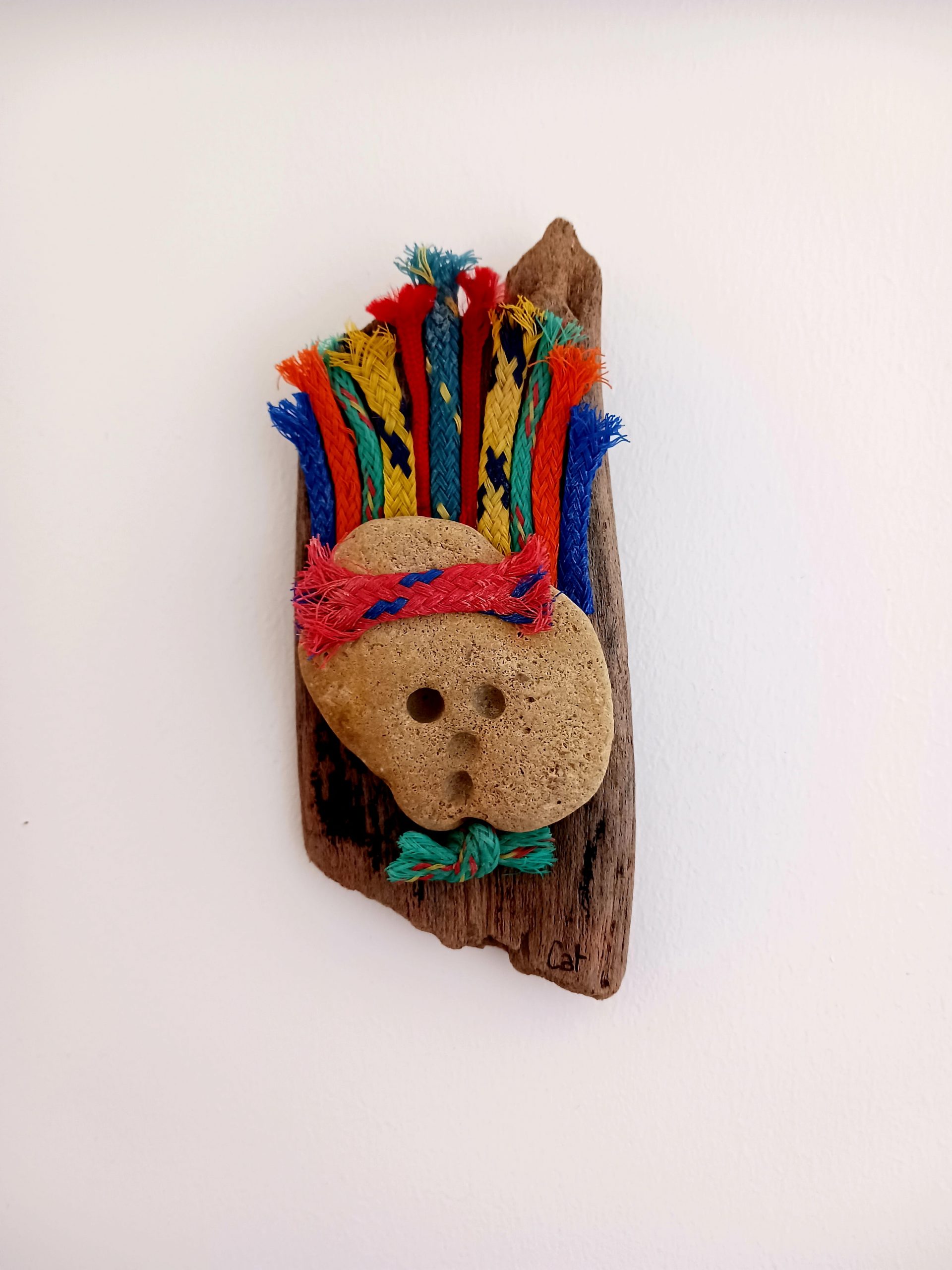 Réalisé à partir de bois flotté, galet et bouts de filets et voilà un élégant Manitou et sa coiffe colorée