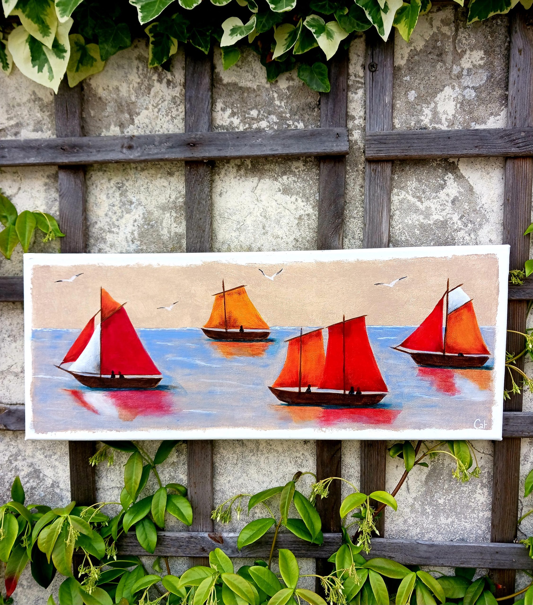 Flotille de vieux gréments de plaisance dans les tons de rouge et d’orangé